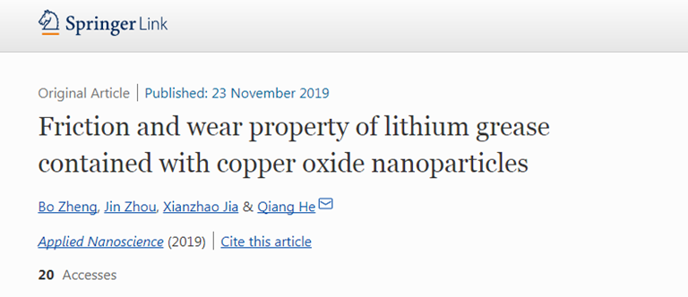 近日,必一运动与河南科技大学联合培养的研究生郑博收到国际著名SCI期刊Applied Nanoscience(中科院二区)论文出版通知,他的论文《Friction and wear property of lithium grease contained with copper oxide nanoparticles》将作为封面文章进行推荐,该文章以必一运动公司为第一单位,郑博为第一作者,何强为唯一通讯作者,这是公司联合培养研究生高水平研究论文的突破。