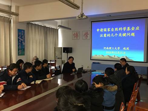 然后,赵波教授阐述了基金申报前应注意的几个问题,包括:1、关注当年国家基金委的年度目标与资助方向。2、关注上一年国家基金资助的总体情况。3、总结上一年自然科学基金资助项目的特点。4、对上一年河南省高校获基金进行统计并对公司基金申请现状展开分析,通过基金申请现状分析,肯定自己的进步,同时也正视自己的不足与差距。5、自然基金同行评议要点分析。6、分析不予立项的原因,避免基金本子出现低级错误。7、摆正基金申请的指导思想:要注重持续积累,不怕失败,提前准备等。8.申请书中的几个关键点,其中着重强调了项目的创新性,同时通过举例对如何选题展开了深入交流与探讨。